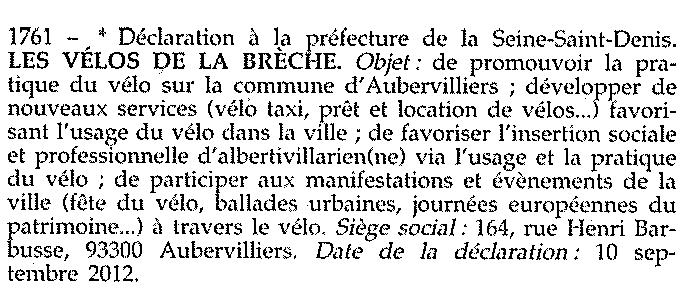 Le Journal Officiel du samedi 13 octobre 2012 a publié la création de l’association « Les Vélos de La Brèche ». Bonne nouvelle, une nouvelle étape administrative franchie ! Il ne manque plus que le numéro INSEE et l’ouverture d’un compte en banque a priori au Crédit Coopératif… Quoiqu’il en soit, les demandes de subvention sont en cours. La ville d’Aubervilliers a accusé réception de notre demande. Prochains dépots : Communauté d’agglomération Plaine Commune, fondations MACIF et RATP, Conseil général de Seine Saint Denis,…