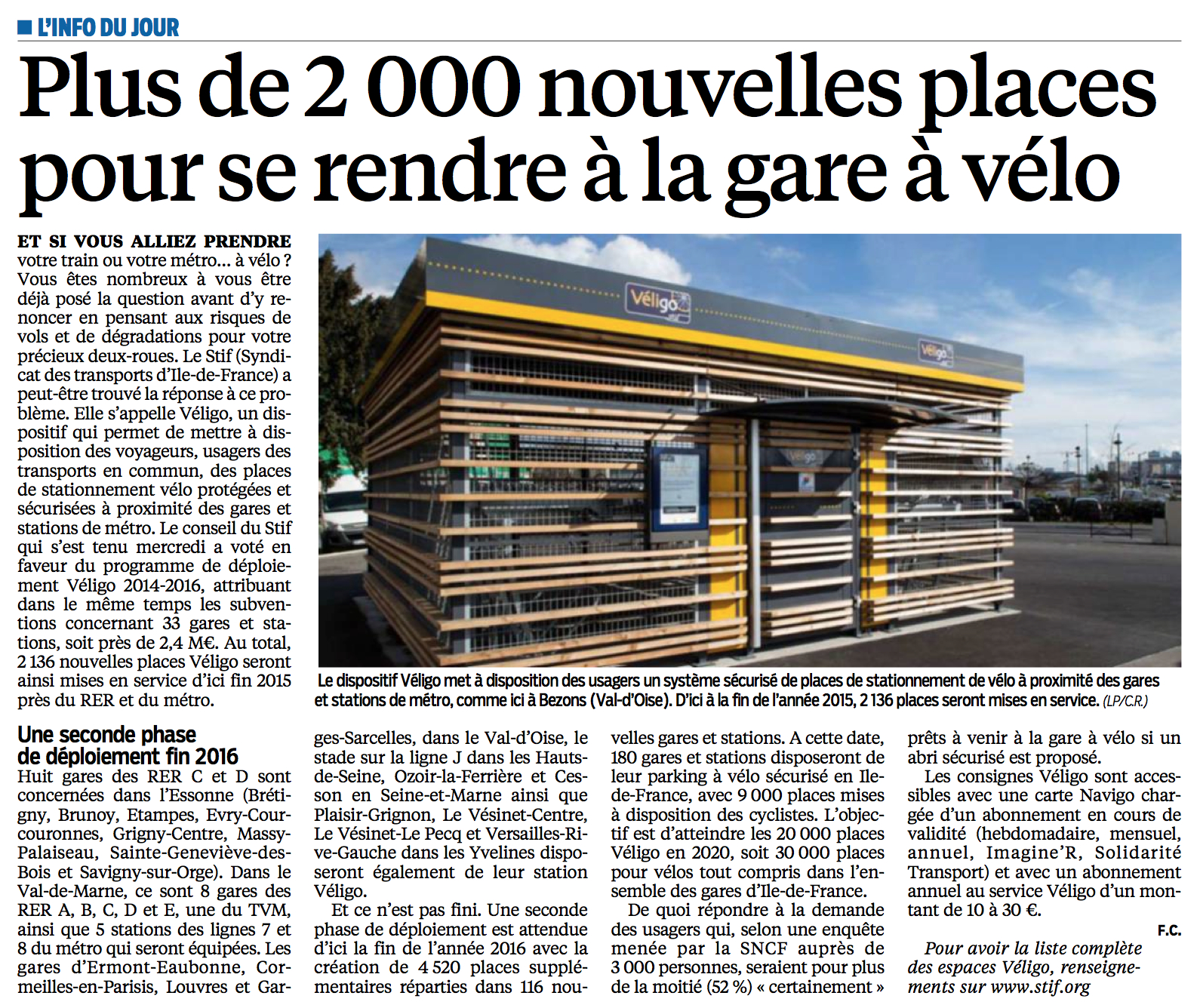 Excellente initiative et décision. Il est plus que temps pour l’Ile de France de développer de vraies politiques d’intermodalité. La province est, de ce point de vue, beaucoup plus en avance. On attend juste que la Seine-Saint-Denis soit concernée… Manifestement, ce n’est pas encore le cas à la lecture du communiqué du STIF (STIF_-_Programme_de_deploiement_Veligo). Et pourtant, ne serait-ce qu’à Aubervilliers, on voit bien l’intérêt d’une station Place du Front Populaire pour le métro ou le RER B pour la station Aubervilliers – La Courneuve. Rendez-vous en 2016 ?…