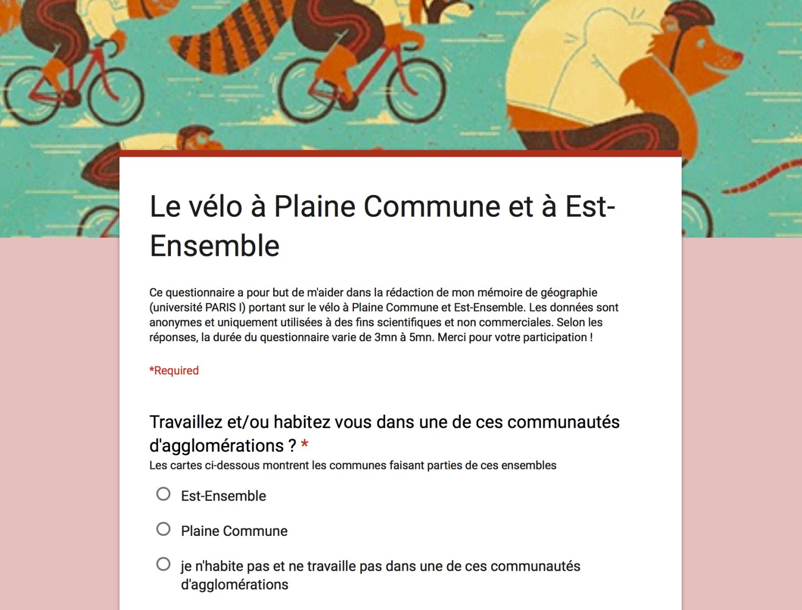 Quelques minutes de votre temps pour compléter un questionnaire sur le vélo à Plaine Commune et Est-Ensemble et aider un jeune étudiant, Nicolas Phan Van Phi, dans la rédaction de son mémoire de maitrise. Les données sont anonymes et uniquement utilisées à des fins scientifiques et non commerciales. Ce questionnaire est ouvert aux cyclistes pratiquants, croyants ouLire la suite « Un petit questionnaire pour faire avancer la place du vélo à Plaine Commune et à Est-Ensemble ! »