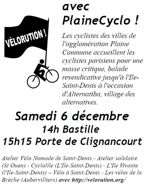 Le 6 décembre, Vélorution organise une balade revendicative qui part de la place de Bastille (14h) pour aller jusqu’à L’ile Saint Denis en passant par la Porte de Clignancourt (15h15). Le trajet « Porte de Clignancourt – L’ile Saint Denis » est visible sur le site openrunner. Dans le cadre du collectif « PlaineCyclo », les Vélos de LaLire la suite « « La Vélorution, c’est maintenant » (rdv samedi 6 décembre après-midi) »